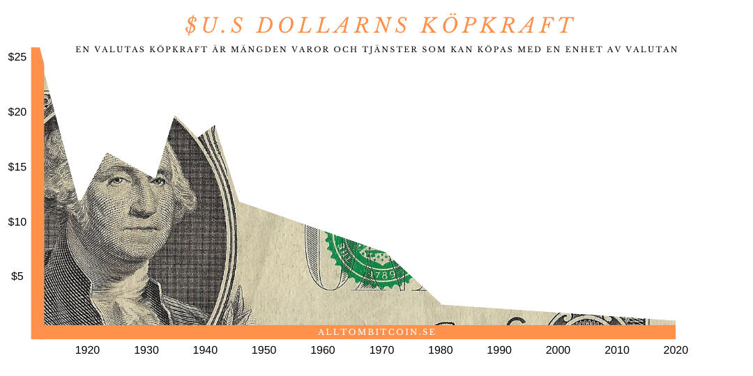 US dollarns inflation och förlust av köpkraft1913 fick USA:s centralbank Federal Reserve mandat att hantera penningmängden för att säkerställa ekonomisk stabilitet. Realiteten blev motsatsen då mer pengar än någonsin trycktes och värdet av dollarn mer än halverades på några år.USA ökade penningmängden för att finansiera underskottet under världskrigen följt av Koreakriget och Vietnamkriget. Detta ökade genomsnittspriset på varor och tjänster samtidigt som köpkraften för dollarn sjönk.I slutet av 1960-talet var mängden dollar i omlopp för stort för att kunna backas upp av USA:s guldreserver. President Nixon upphörde omvandlingen av amerikanska dollar till guld 1971. Detta markerade slutet för guldstandarden och hädanefter kunde alla valutor tryckas i oändlighet. Nu 50 år senare så ser vi dödsryckningarna av detta misslyckade experiment.